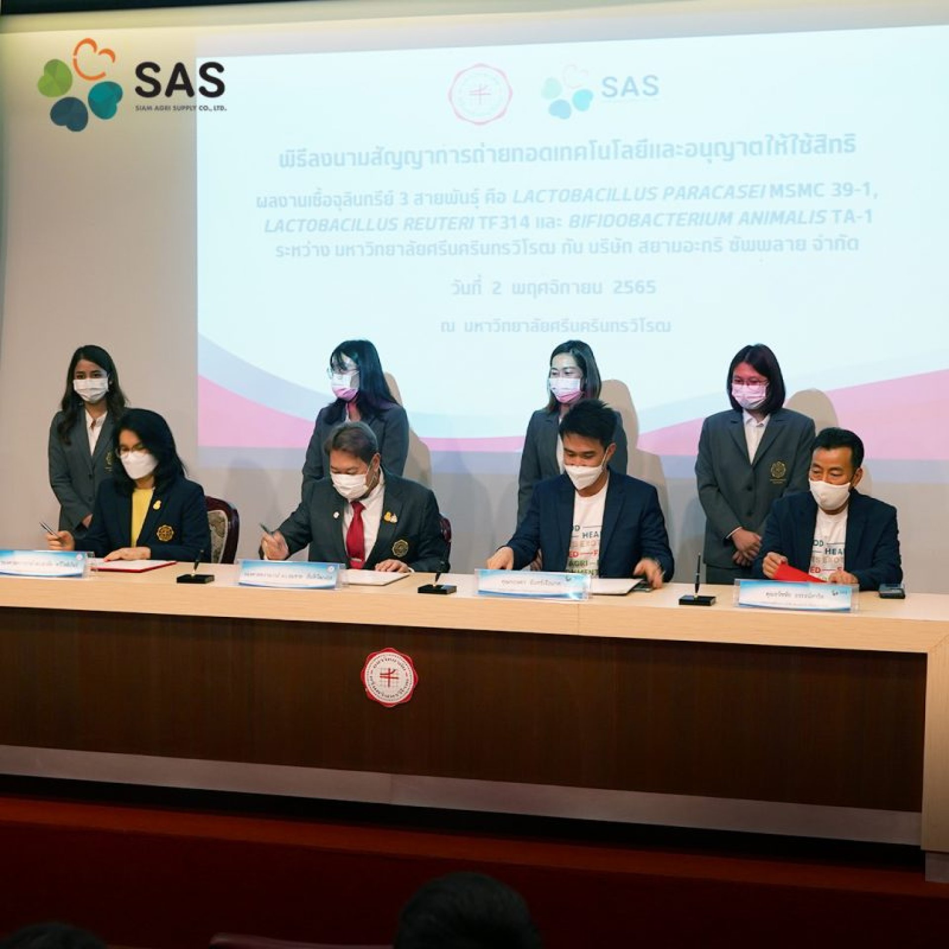 คุณกฤษดา จันทร์เจือมาศ เข้าร่วมพิธีลงนามสัญญาการถ่ายทอดเทคโนโลยีและอนุญาตให้ใช้สิทธิผลงานจุลินทรีย์โพรไบโอติกระหว่างมหาวิทยาลัยศรีนครินทรวิโรฒ ซึ่งเป็นผลงานที่ประดิษฐ์โดย รองศาสตราจารย์ ดร.มาลัย ทวีโชติภัทร์ สังกัดคณะแพทย์ศาสตร์ โดยมี อธิการบดีมหาวิทยาลัยศรีนครินทรวิโรฒ รองศาสตราจารย์ ดร.สมชาย สันติวัฒนกุล ให้เกียรติเป็นประธานพิธีลงนามสัญญา พร้อมด้วยคณะนักวิจัย และทีมงานบริษัทร่วมเป็นสักขีพยาน วันพุธที่ 2 พฤจิกายน 2565 ณ ห้องปฐมบริบท อาคารประสานมิตร 3 (อาคารหอจดหมายเหตุ หอเกียรติยศ) มหาวิทยาลัยศรีนครินทรวิโรฒ ซึ่งมีการถ่ายรูปร่วมแสดงความยินดี และมอบของที่ระลึก